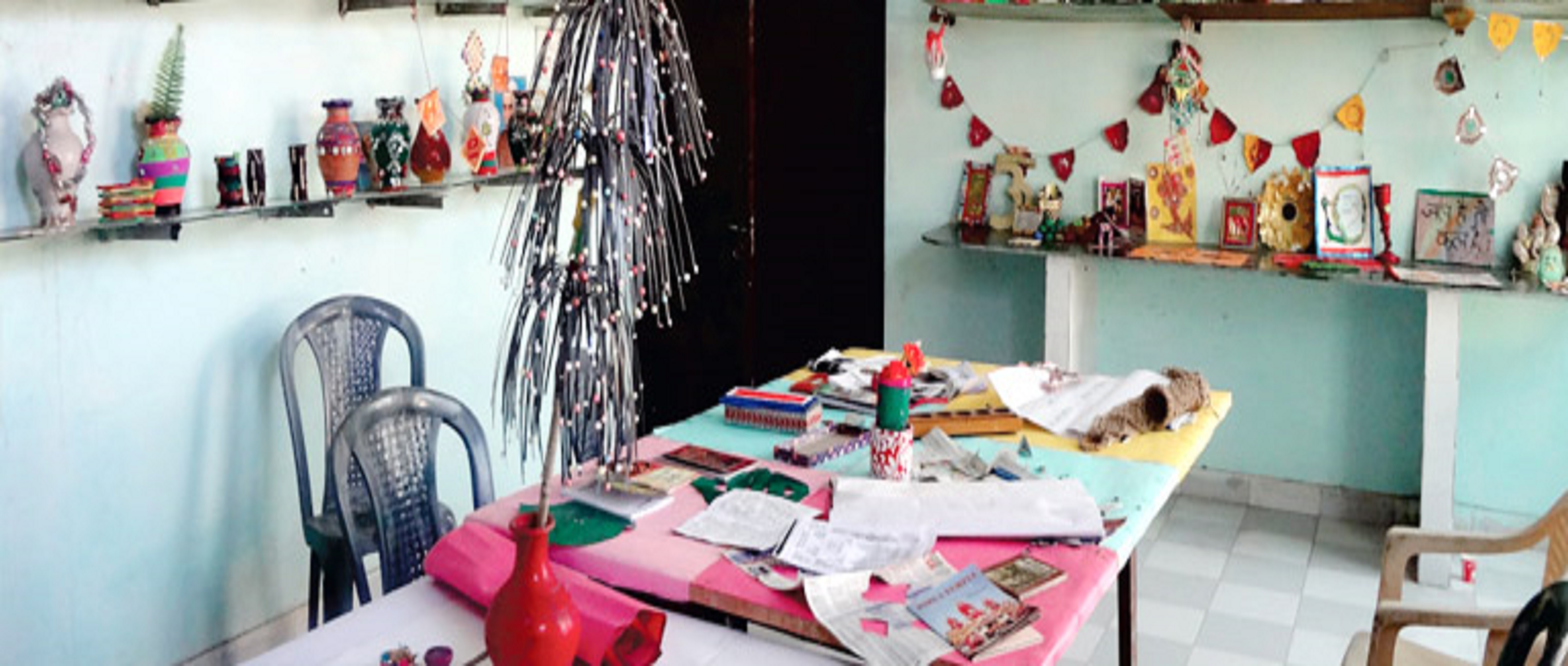 Resource centre are housed in a well designed specious room with adequate electricity and tools, equipments, furniture, raw material, reference materials/books, periodicals and motivational works. The room is equipped with material for charts and models making moulds for candle making & paper cutting, pot decorating essential material for interior decoration preparing best out of waste etc.